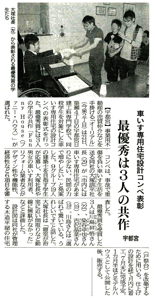 当社企画の車椅子専用バリアフリー住宅の設計コンペの表彰式が下野新聞に掲載されました。 画像をクリックすると大きい記事が開きます。
