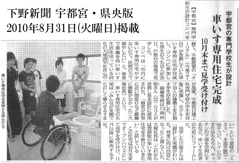当社企画の車椅子専用バリアフリー住宅の設計コンペ参加学生の現地見学の様子が下野新聞に掲載されました。 画像をクリックすると大きい記事が開きます。